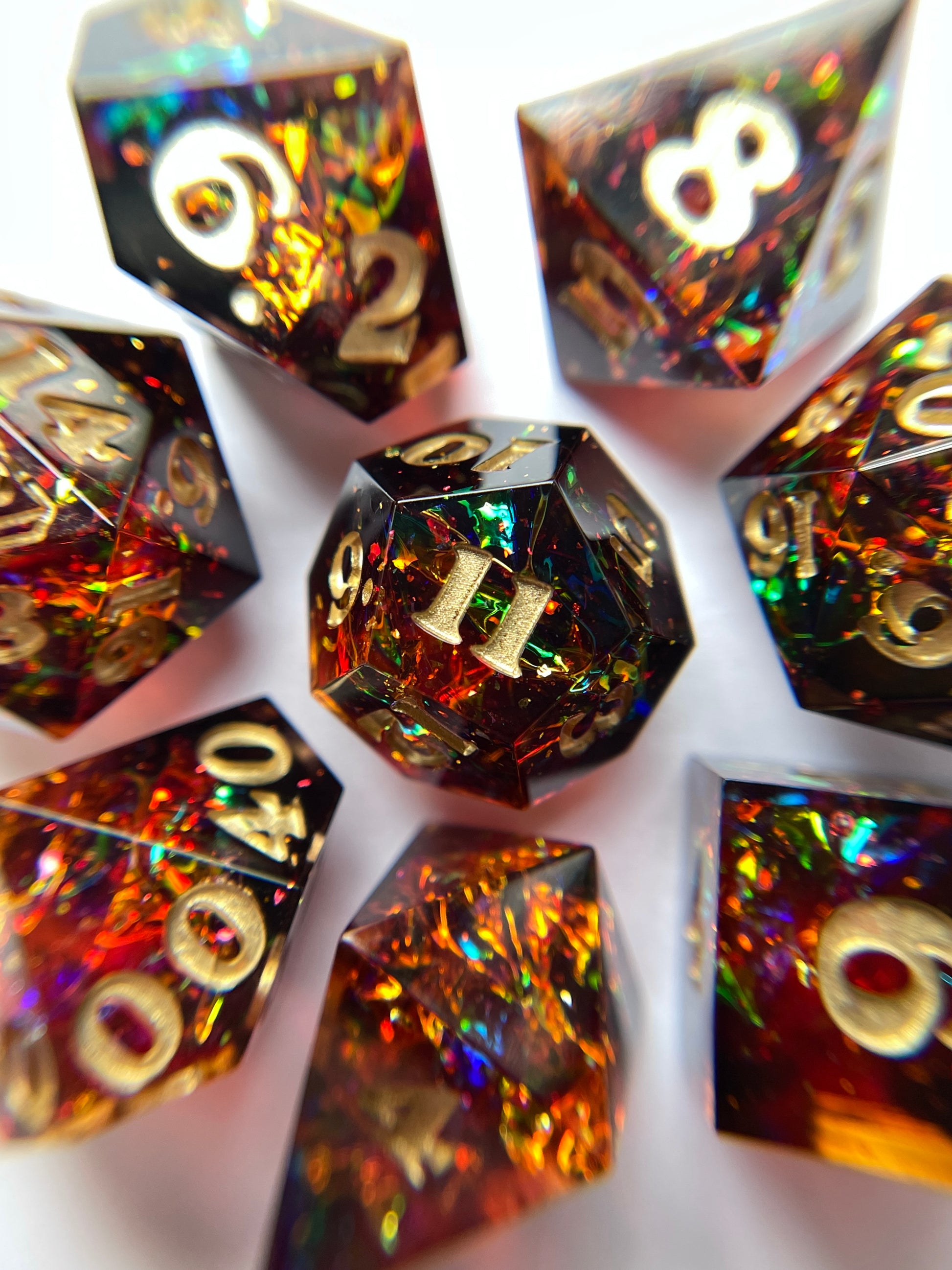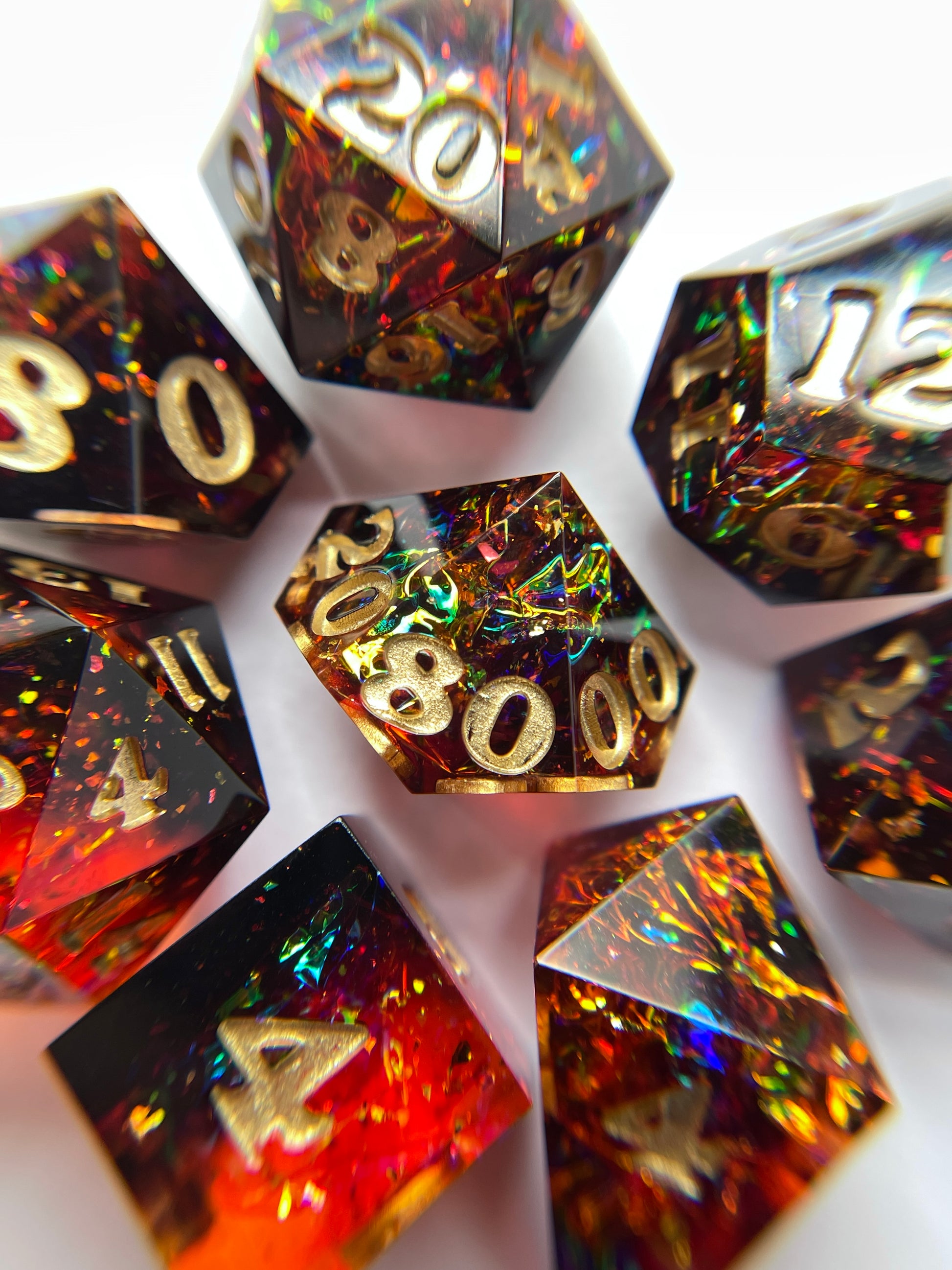 This design is made of bright orange resin that fades to black with bright iridescent flashes of red/blue/green, gold flake, and iridescent flake inside. Inked in metallic gold. Comes with a shard d4 shape and your choice of a logo crit-faced d20 or a numbered "20" crit-faced d20. Please select above.