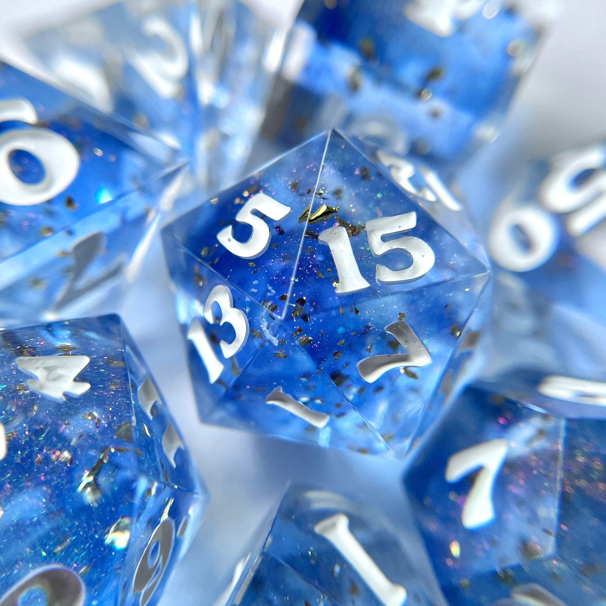 Cornflower blue resin is melded with clear that also holds wisps of colorshifting red and purple shimmer and gold leaf. Inked in bright white. Comes with your choice of a logo crit-faced d20 or a numbered "20" crit-faced d20. Please select above.