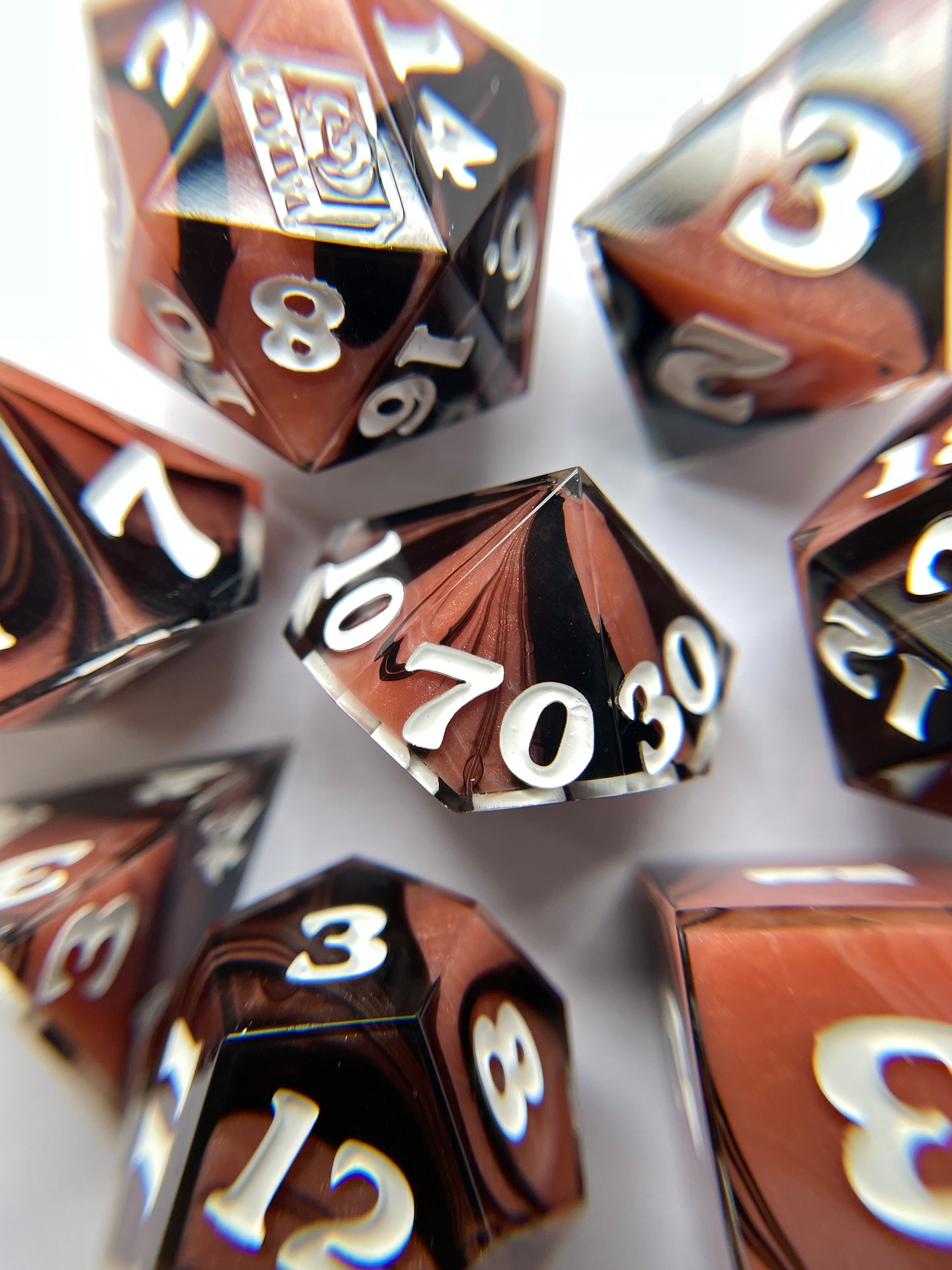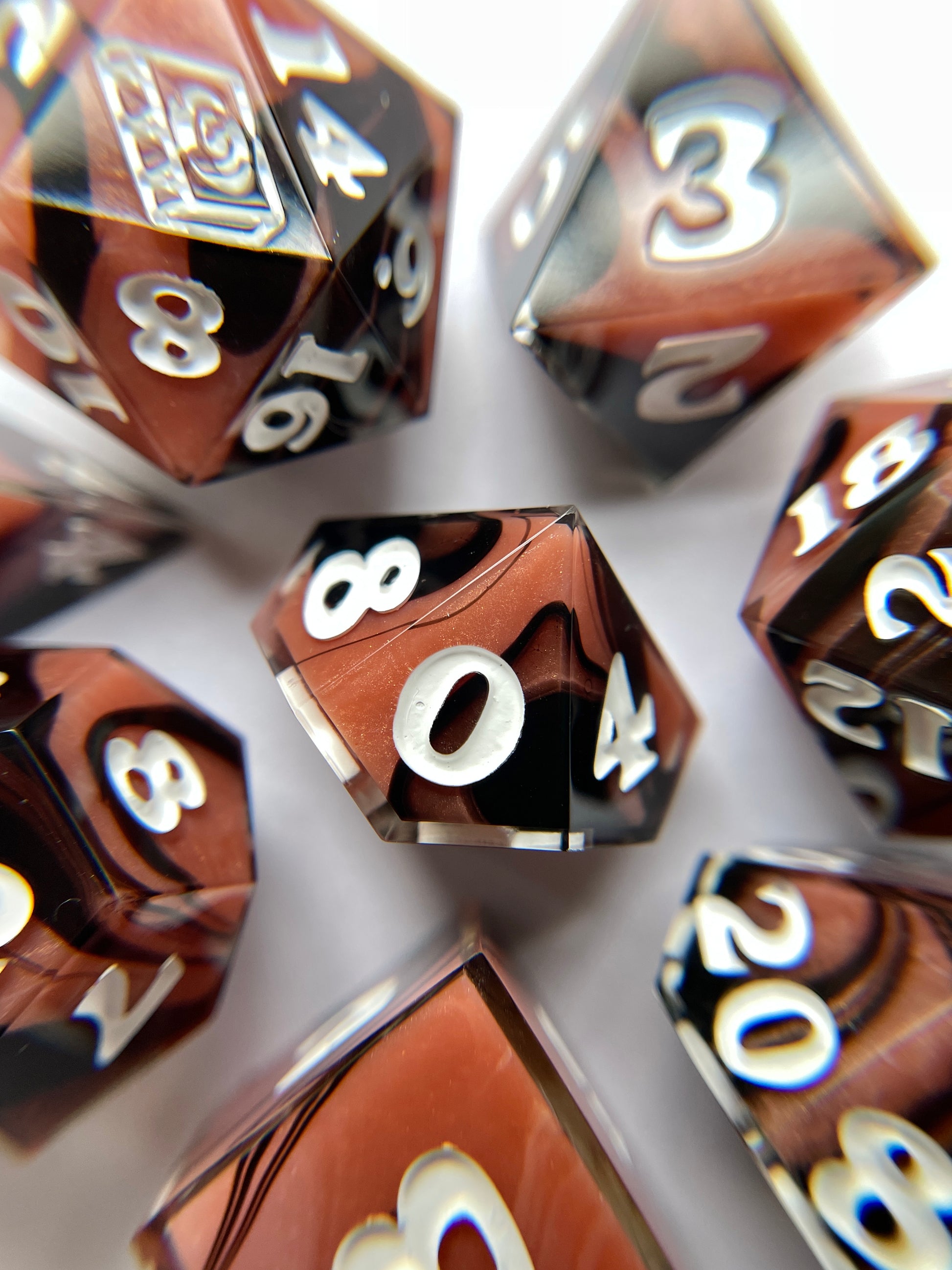 This design features burnt orange and black swirls. Inked in bright white. Comes with a caltrop d4 shape and your choice of a logo crit-faced d20 or a numbered "20" crit-faced d20. Please select above.