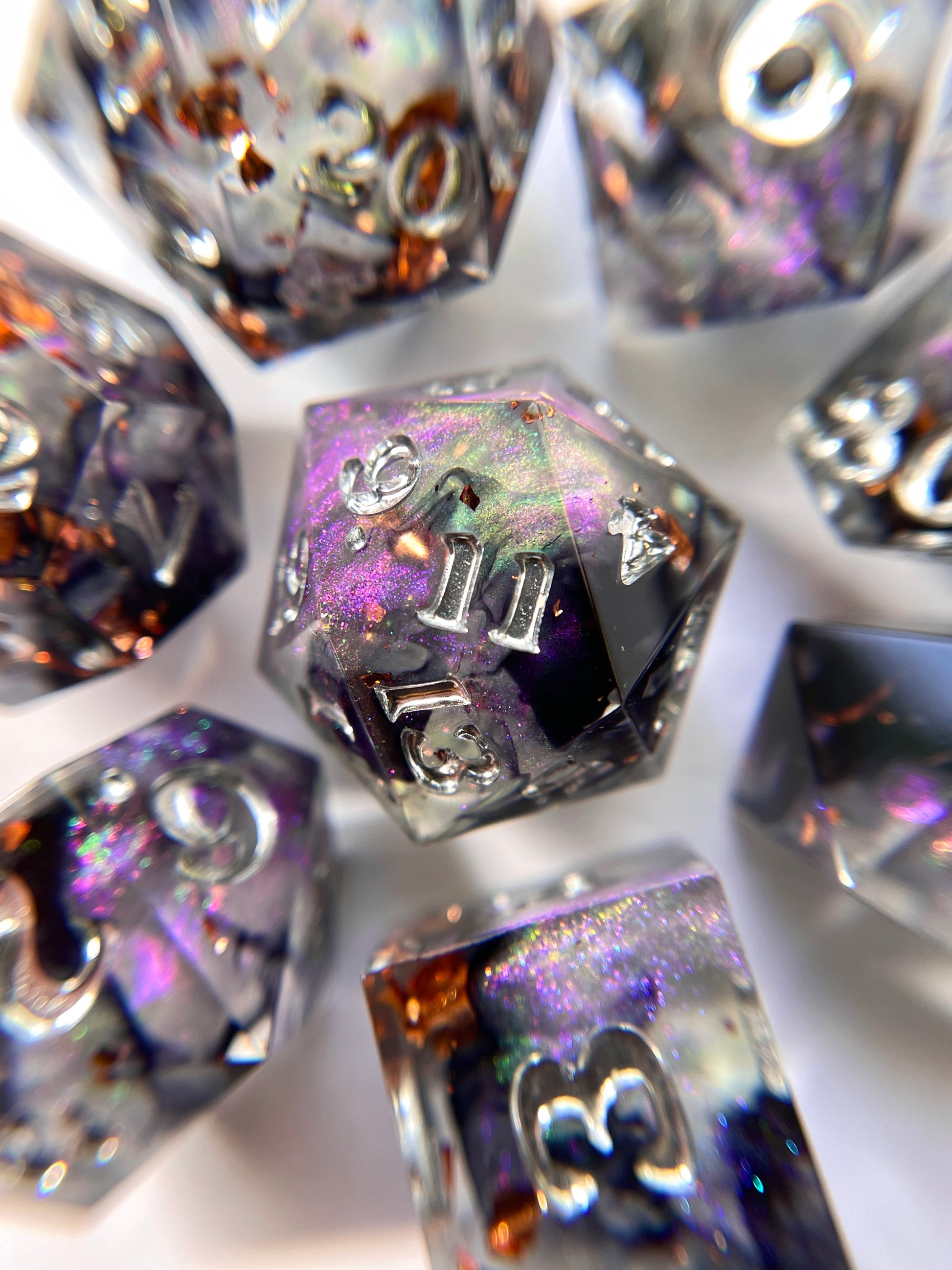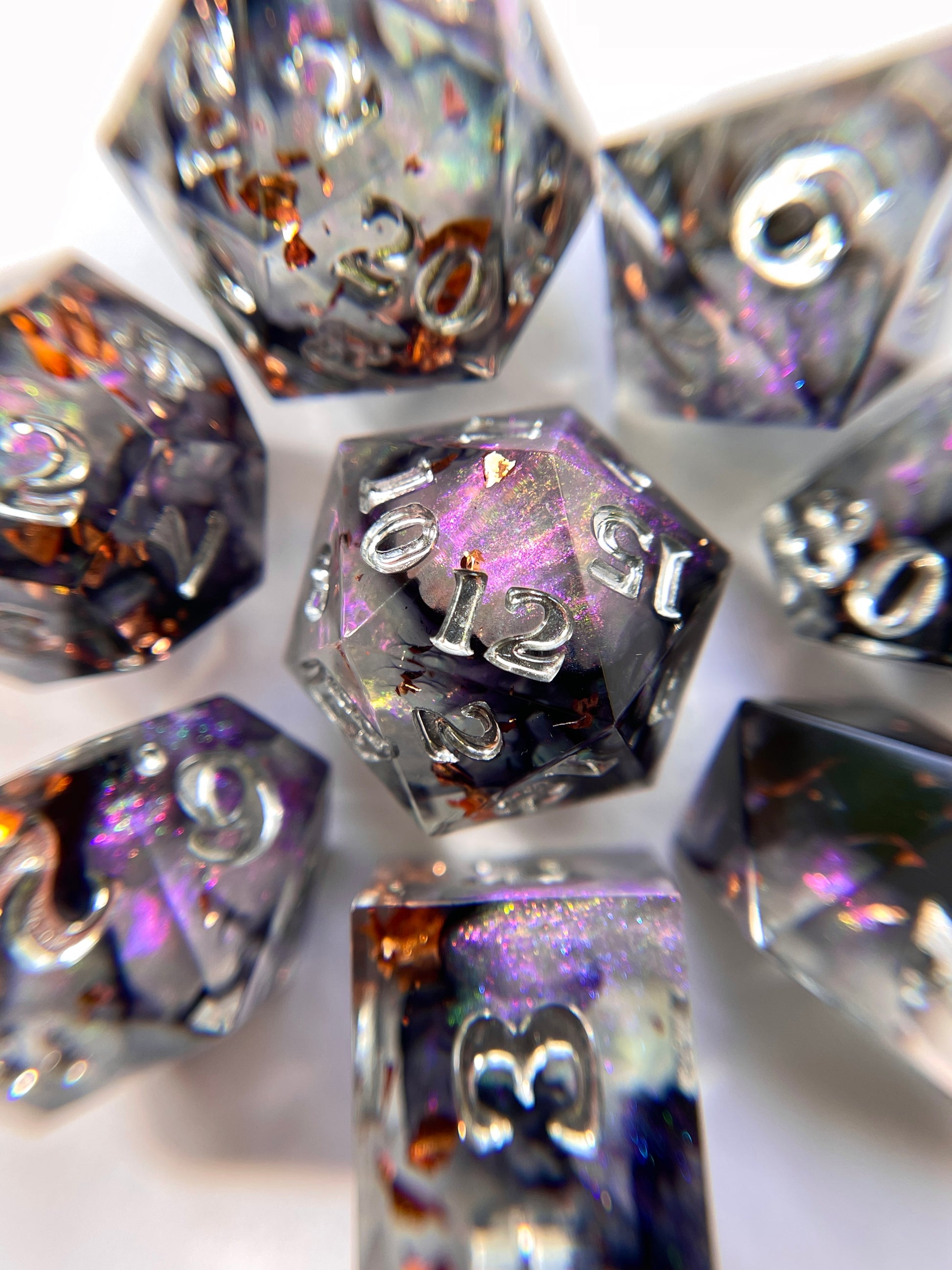 This design features clear dice that are filled with black inky wisps, copper flake, and burst of purple to green colorshift shimmer. Inked in liquid chrome. Comes with a caltrop d4 shape and your choice of a logo crit-faced d20 or a numbered "20" crit-faced d20. Please select above.