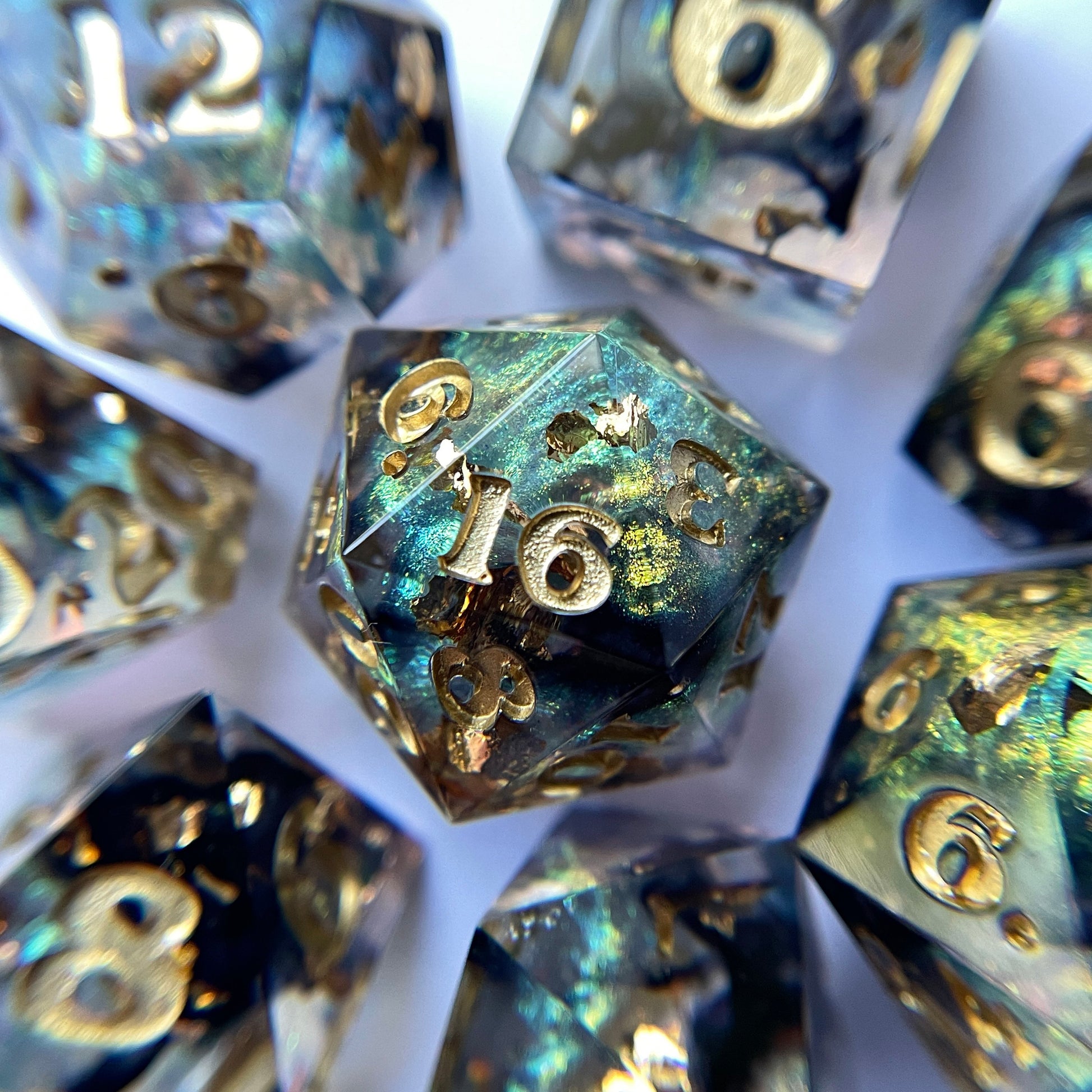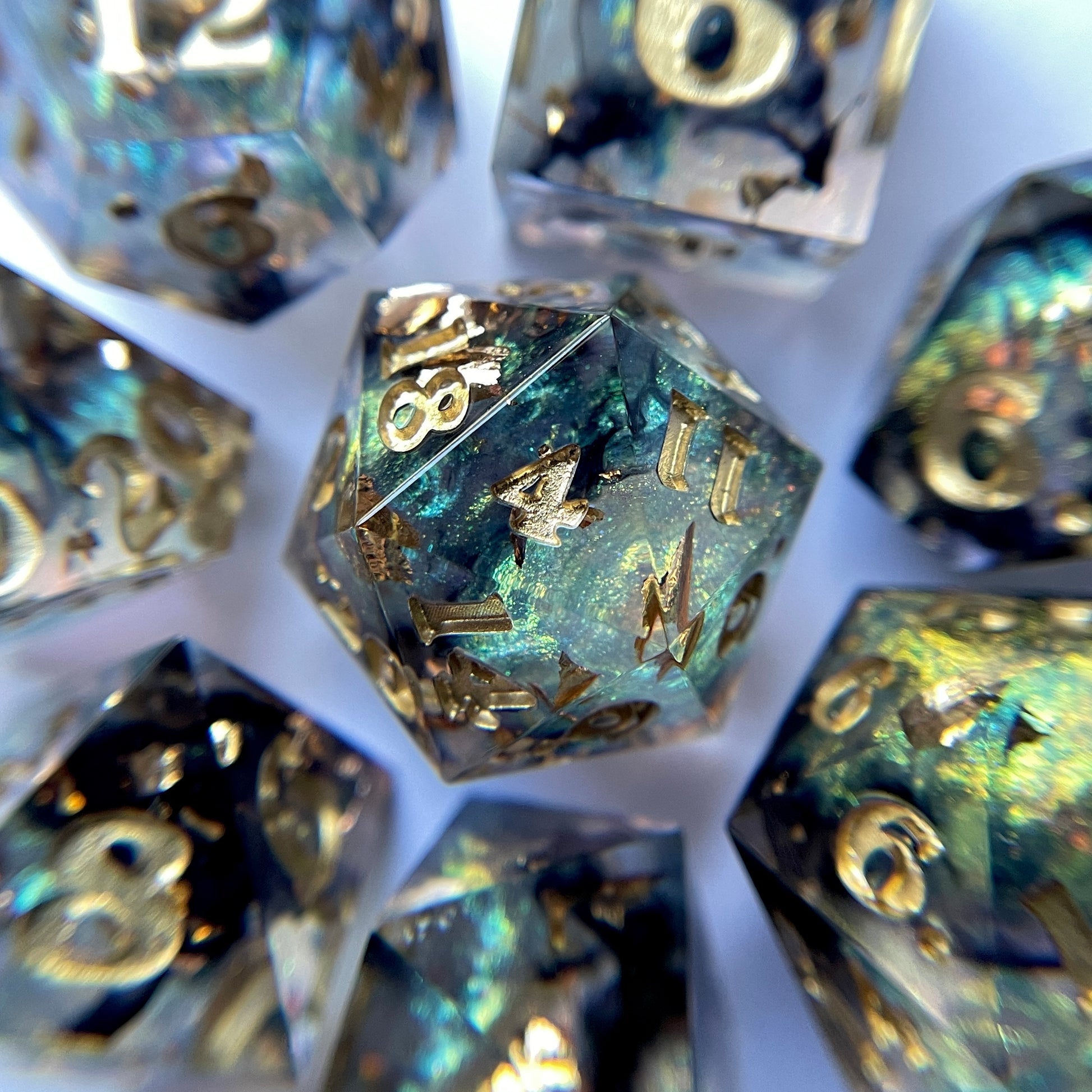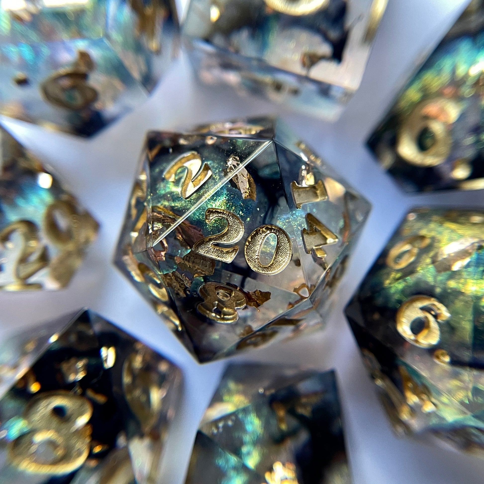 Please know that every set from Spellbound is completely handmade by me. The nature of handmade items means that they will not be perfect, and may have a few nicks or scratches, but I do everything in my power to make these dice with as few flaws as possible. I will document and most likely price cut any dice that have notable flaws. Also note that many designs are made in small batches at the same time. This means that while these designs will be made with the exact same proportions and colors, their distribution of glitter, colored resin, and colorshift may vary from set to set.