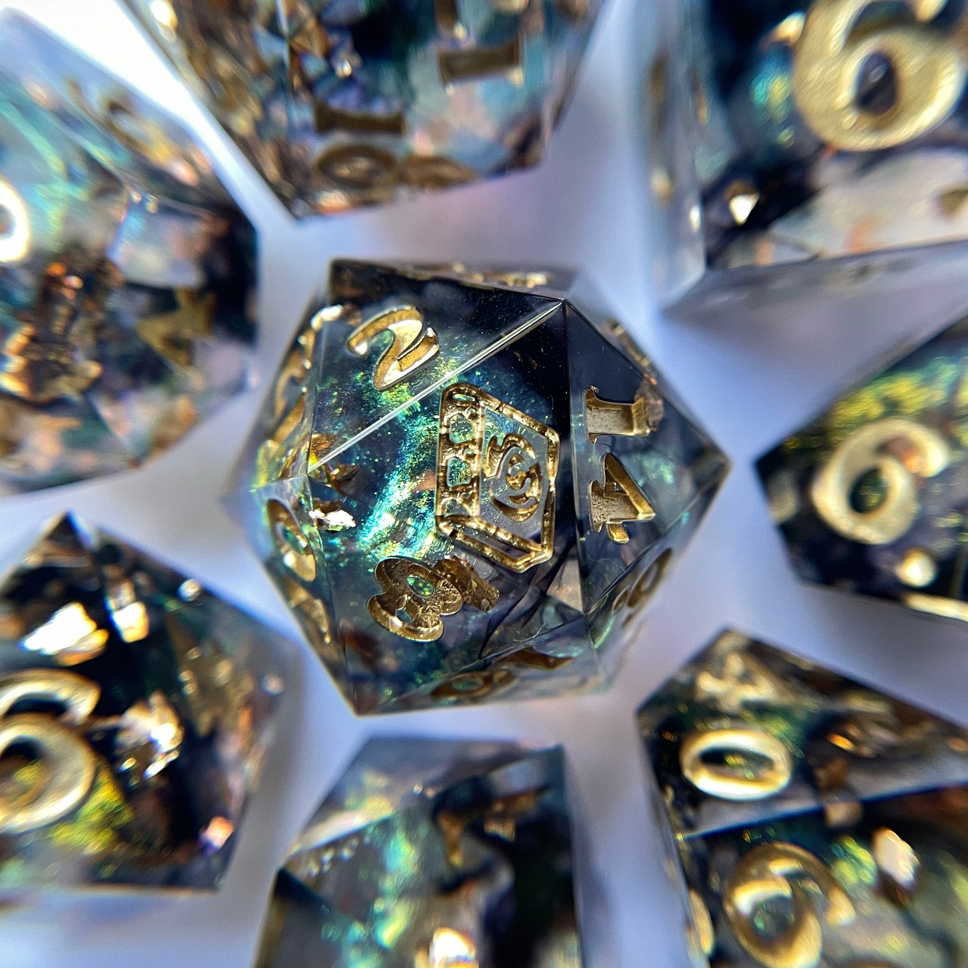 This d20 is clear save for a huge burst of green to blue to yellow colorshifting shimmer, black ink swirls, and gold flake. Inked in metallic gold. Comes with your choice of a logo crit-faced d20 or a numbered "20" crit-faced d20. Please select above.