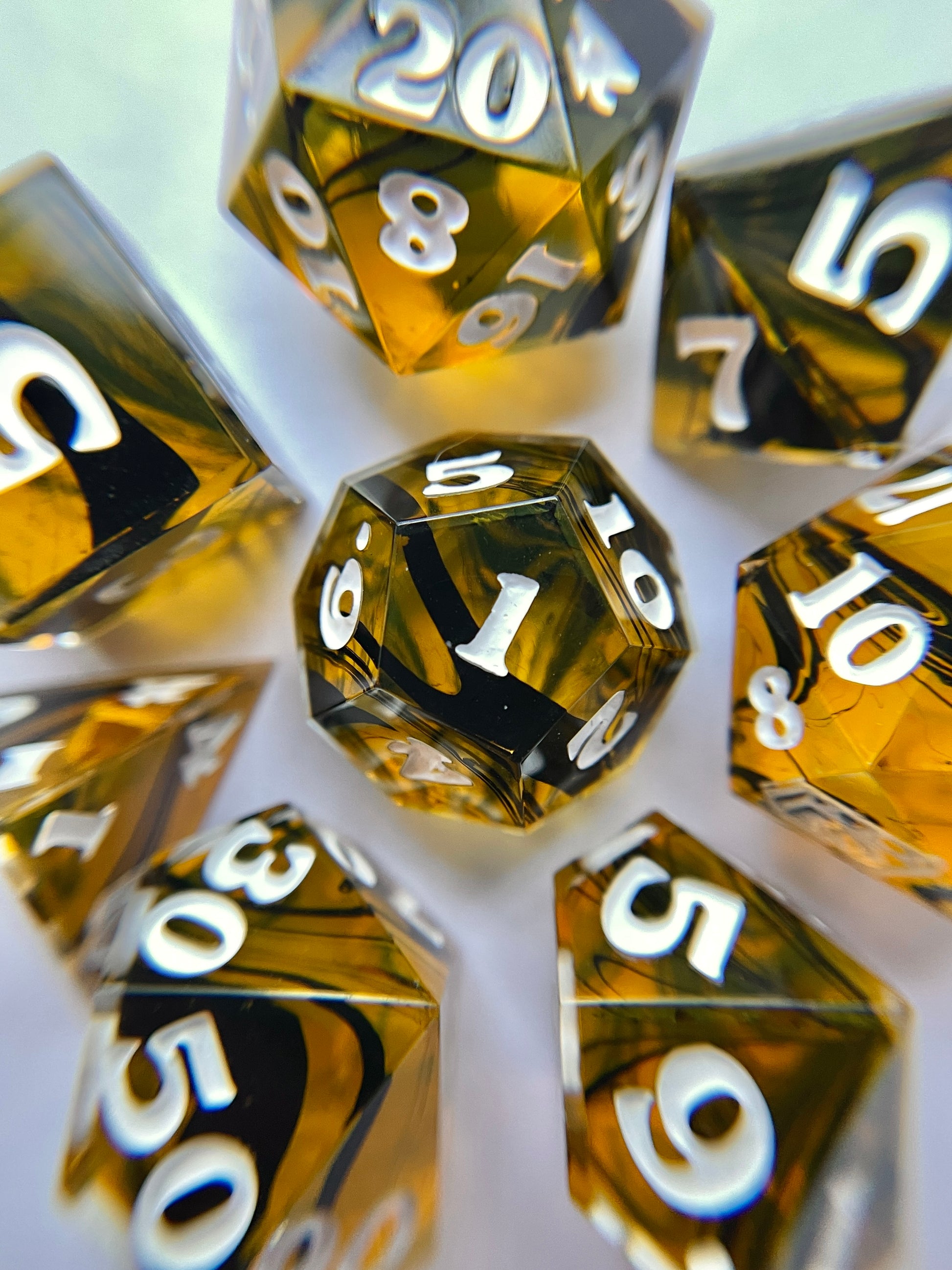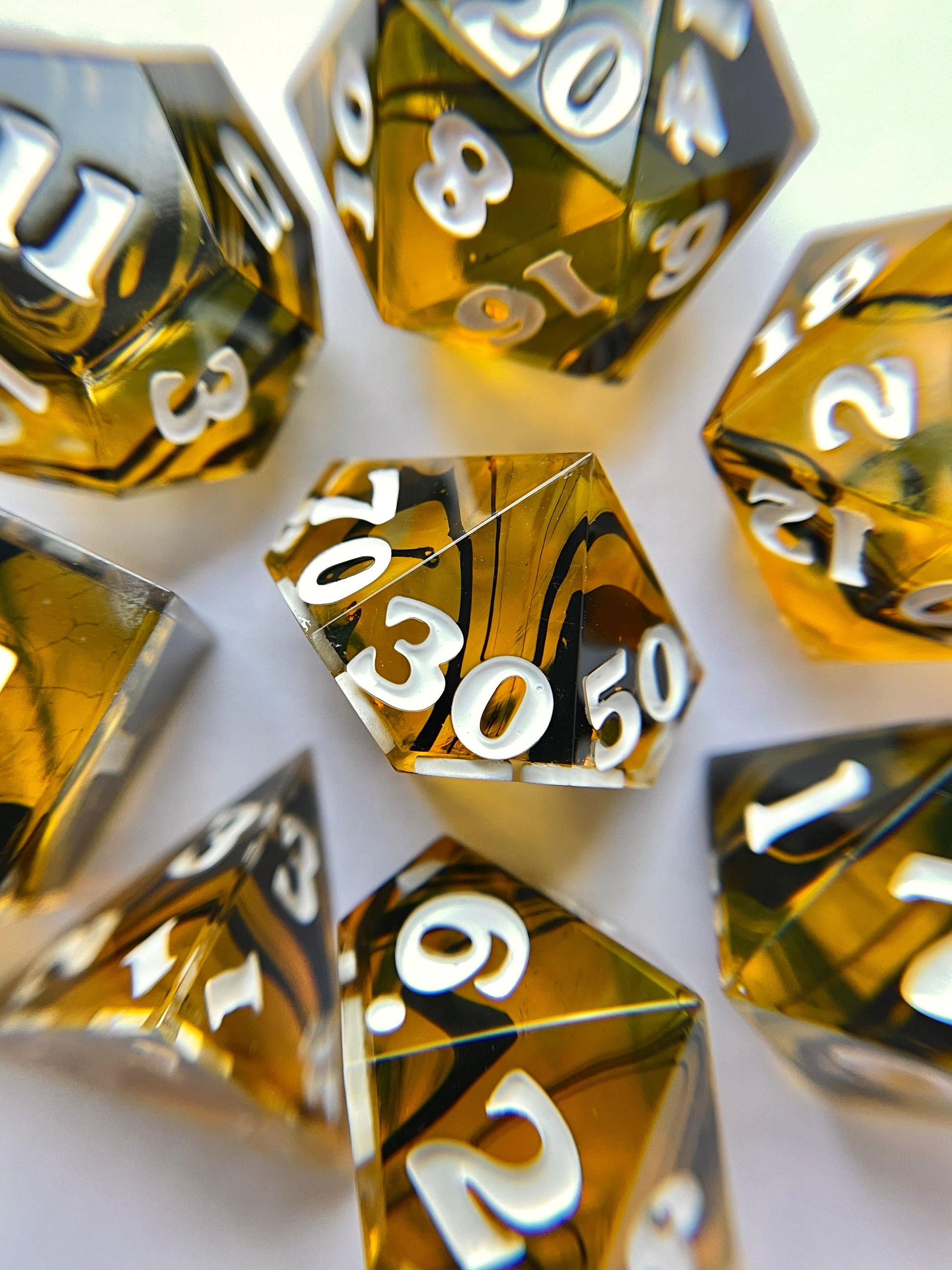 This design features translucent yellow and black ink swirls. Inked in bright white. Comes with a caltrop d4 shape and your choice of a logo crit-faced d20 or a numbered "20" crit-faced d20. Please select above.