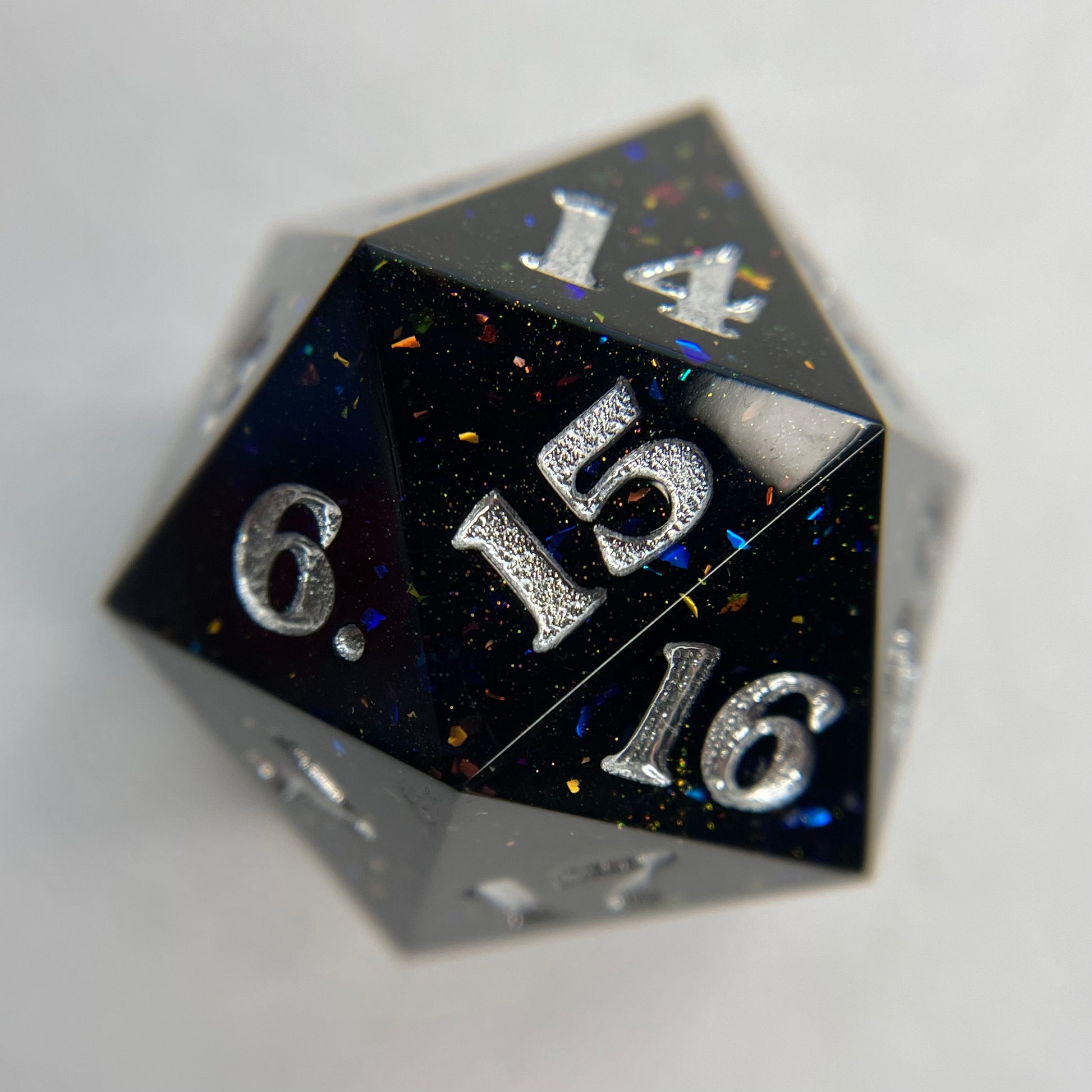 This 23mm spindown D20 is made of black resin filled with bright blue and red mica flake with a subtle red shimmer. inked in liquid chrome. Perfect for your Magic: The Gathering games!